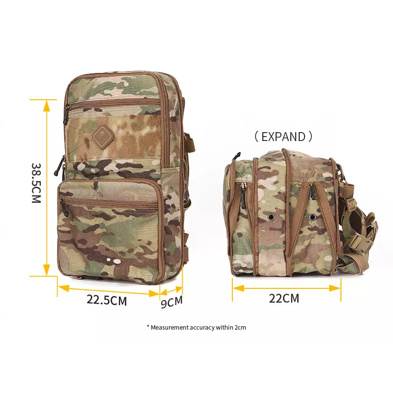 Emersongear D3 Multi-purposed Bag is made of military regulations Cordura 500D nylon, which is durable, abrasion resistance and water repellent. The bag can be used as a small backpack independently, or it can be matched with a special D3CR chest strap to replace the original chest strap as a water bag backpack, so that D3CR can be fully stored when it is stored. The most ingenious part of the bag design is that the expansion zippers are set on each compartment on the package, which is very practical when space is in urgent need.